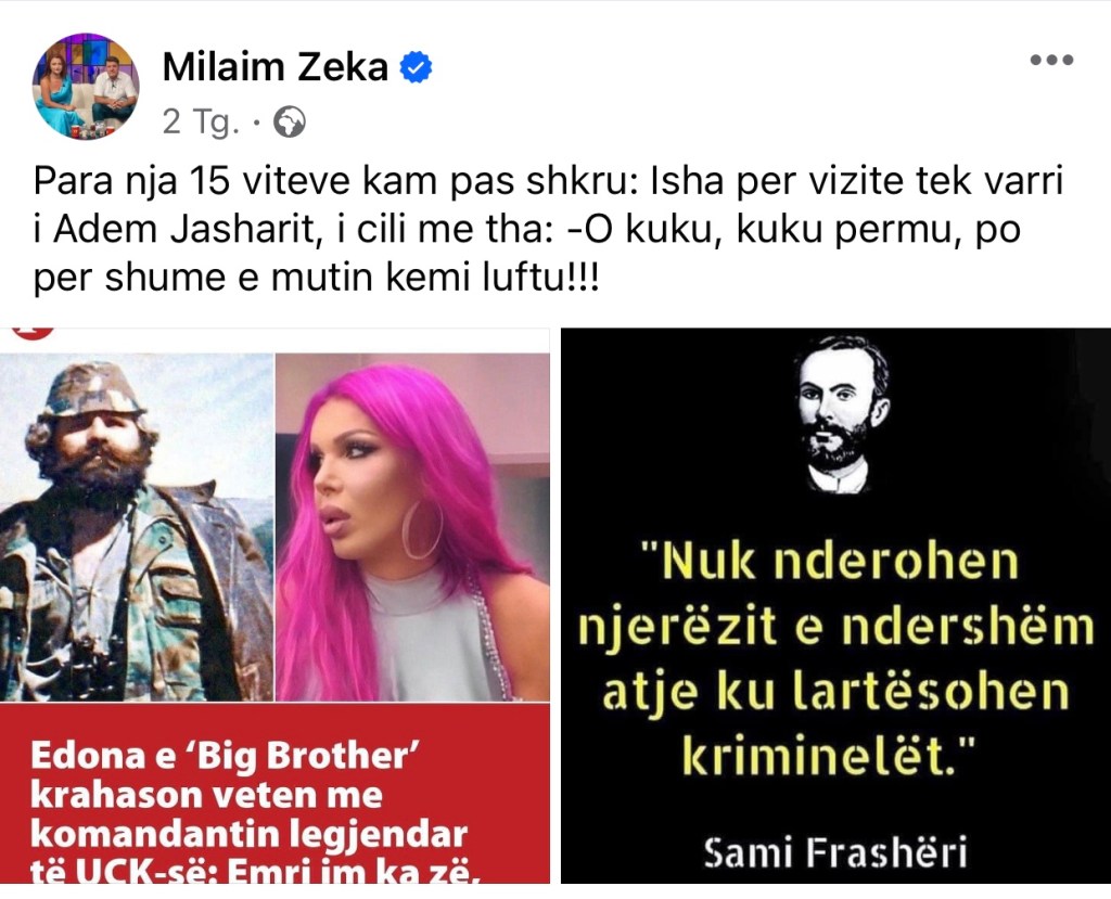 “Para nja 15 viteve kam pas shkru: Isha për vizitë tek varri i Adem Jasharit, i cili më tha: O kuku, kuku përmu, po për shumë e mutin kemi luftu!!!”, ka shkruar Zeka.