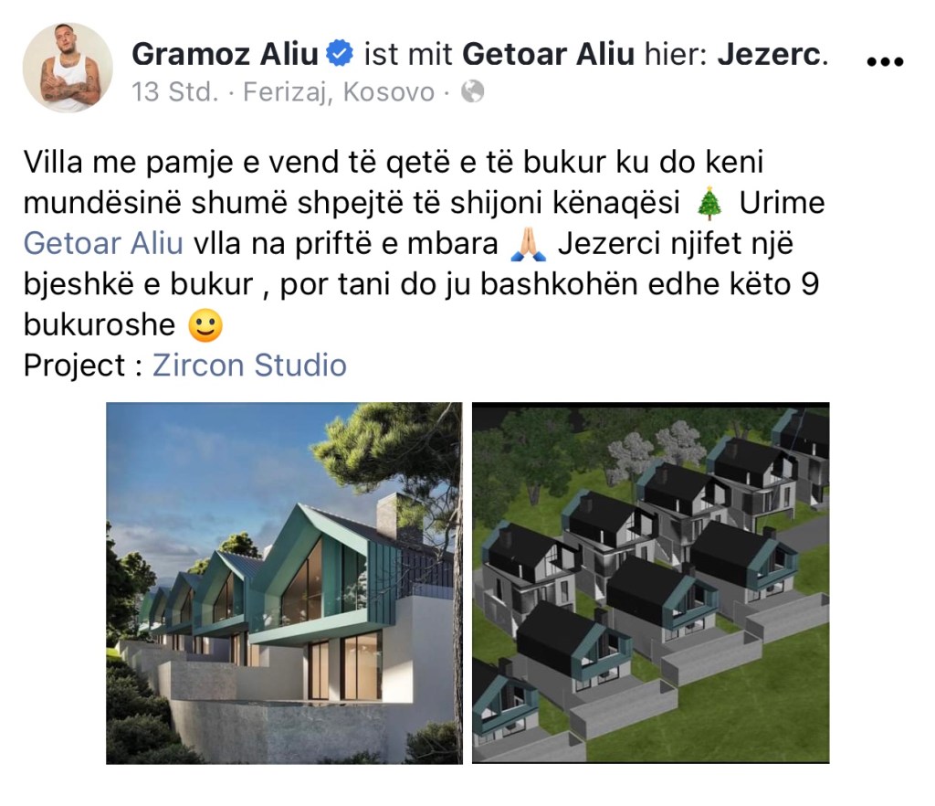 “Villa me pamje e vend të qetë e të bukur ku do keni mundësinë shumë shpejtë të shijoni kënaqësi Urime Getoar Aliu vlla na priftë e mbara. Jezerci njifet një bjeshkë e bukur, por tani do ju bashkohën edhe këto 9 bukuroshe”, ka shkruar Mozzik në rrjetin e tij në Facebook.