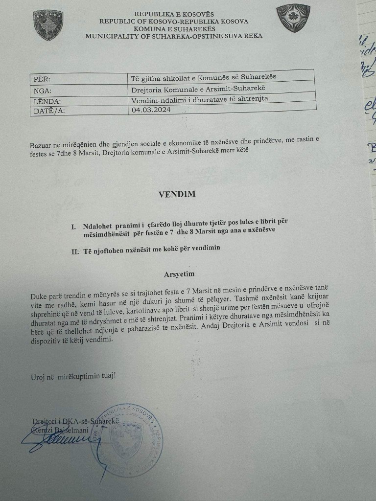 Drejtoria e Arsimit e Suharekës ka marrë vendim që përveç lules dhe librit mësuesit nuk kanë të drejtë të pranojnë dhurata të tjera të shtrenjta. Më poshtë është vendimi: