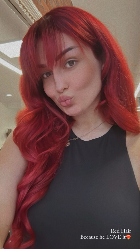 Vesa ka postuar një portret të saj, duke shkruar një fjali të shkurtër dhe shumë domethënëse: “Flokë të kuqe, sepse kështu i do ai”.