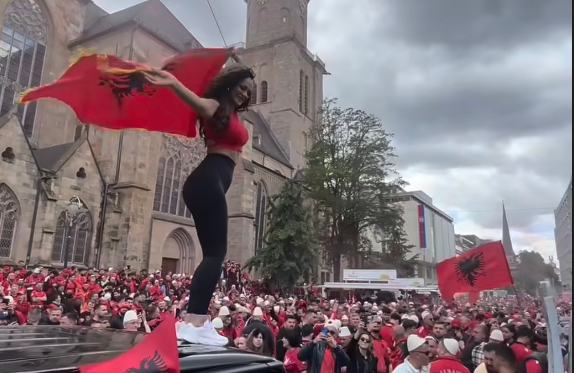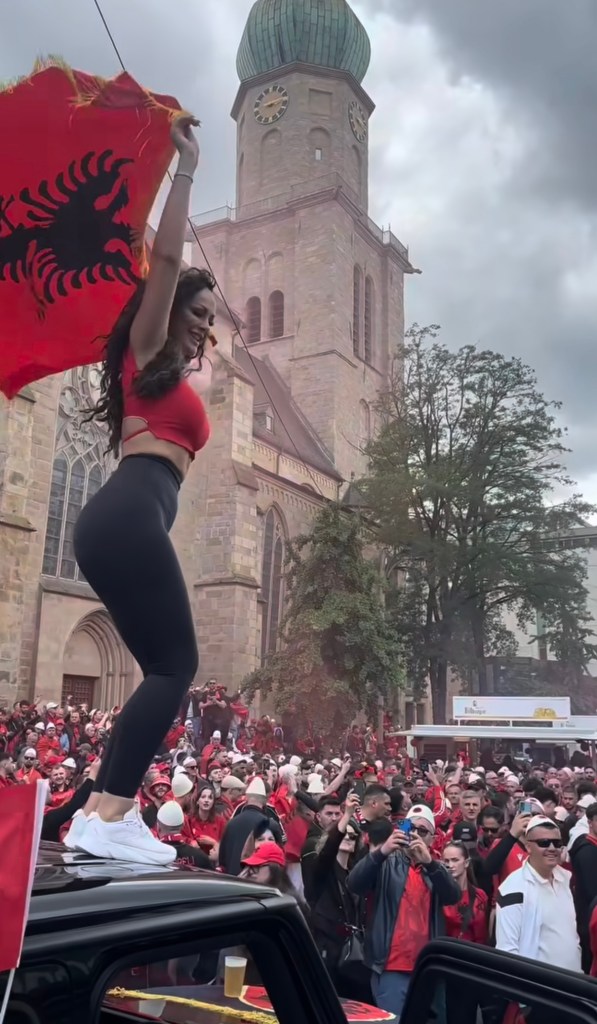 Ajo në rrjetin e saj social ‘’Instagram’’, ka postuar video ku shihet duke mbajtur në dorë flamurin Kuq e Zi e duke kenduar mbi një veturë.